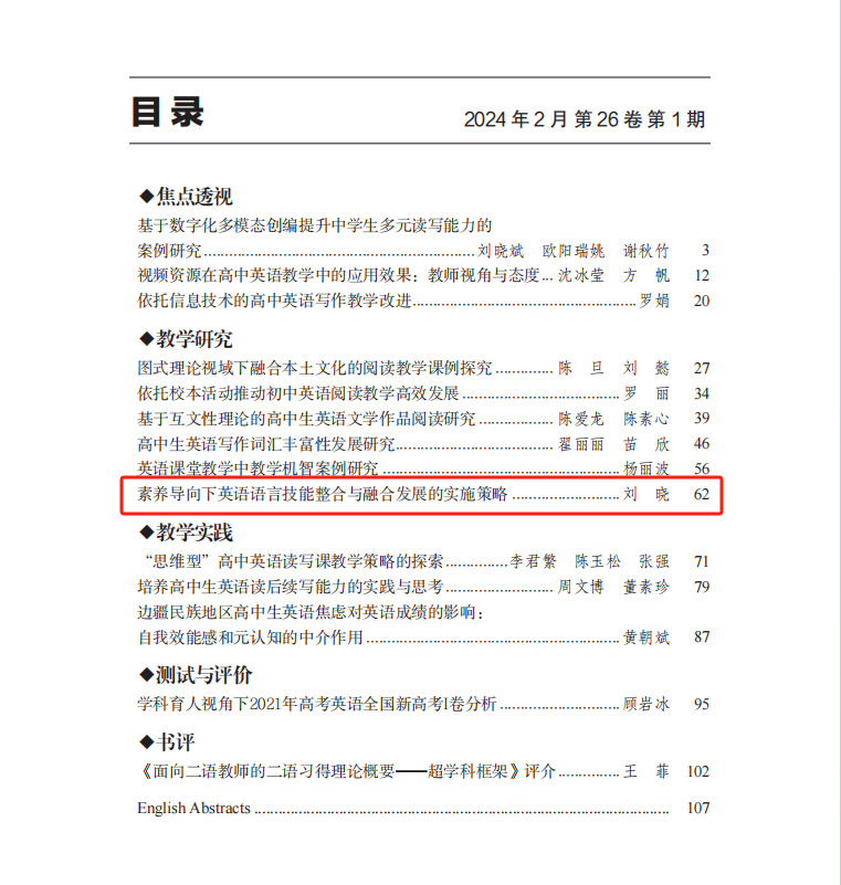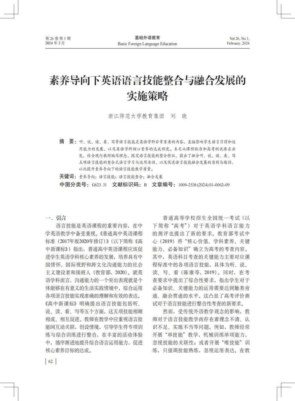 近日,浙师大教育集团专家、特级教师刘晓在核心期刊《基础外语教育》刊文——《素养导向下英语语言技能整合与融合发展的实施策略》。文章提出了融合听、说、读、看、写五项语言技能的整合式语言学习与运用活动,以及促进语言技能融合发展的原则与路径,以此提升素养导向下的语言技能教学质量。