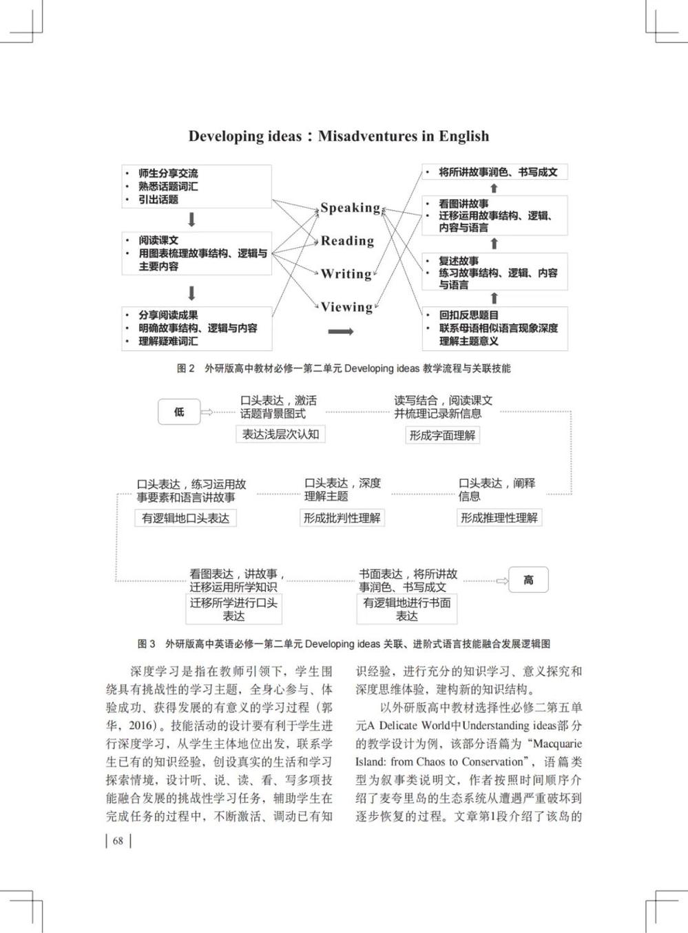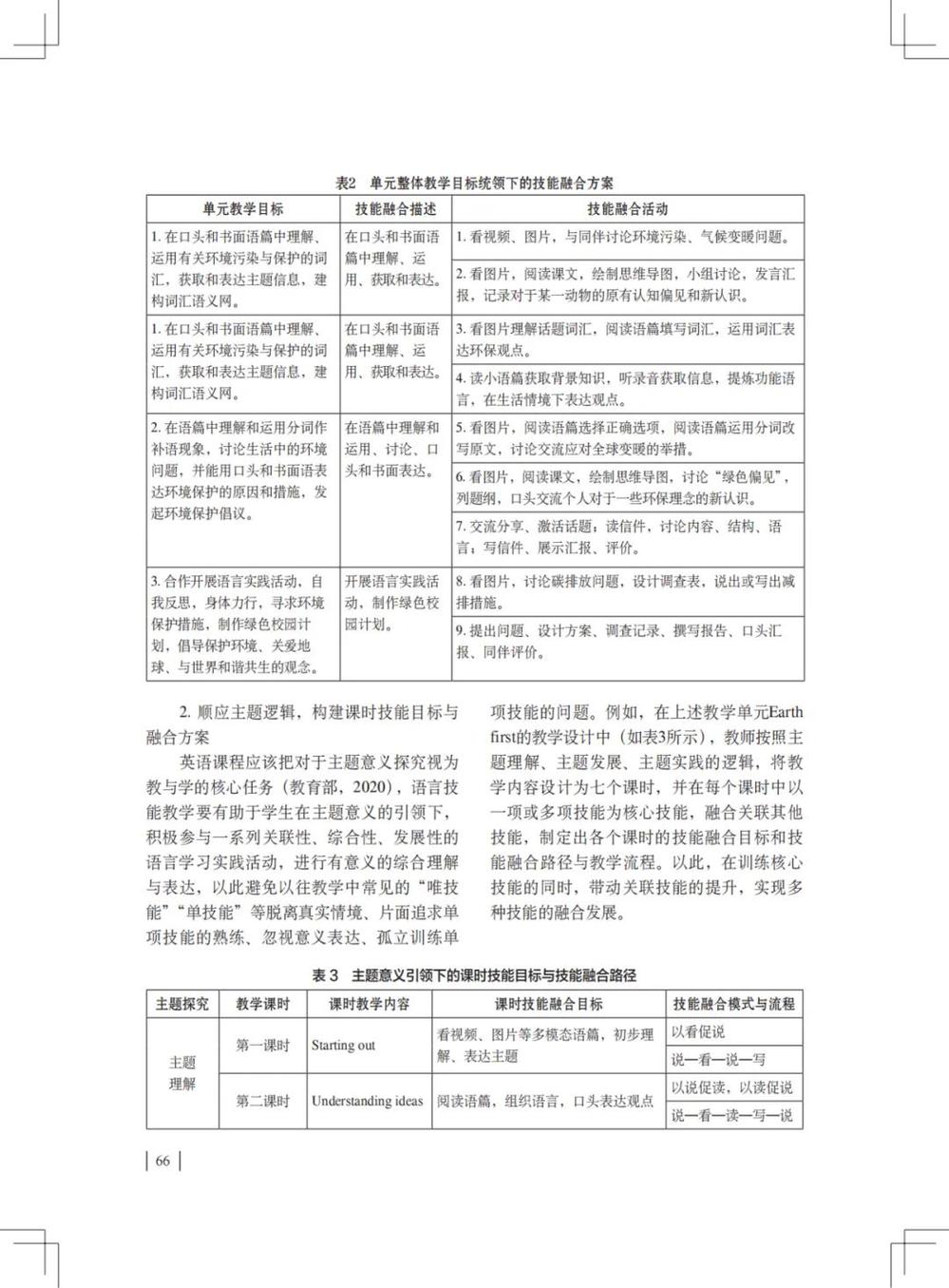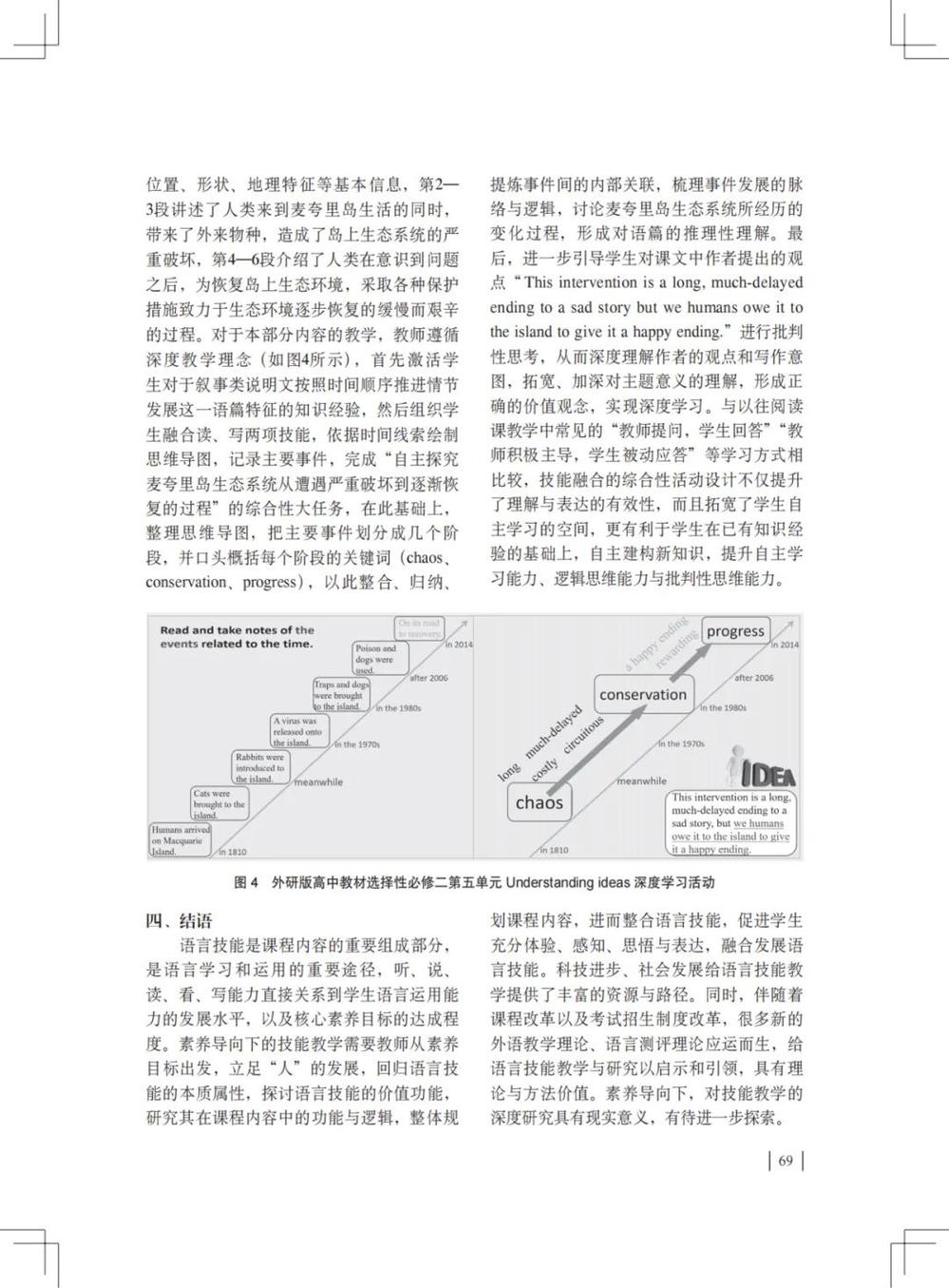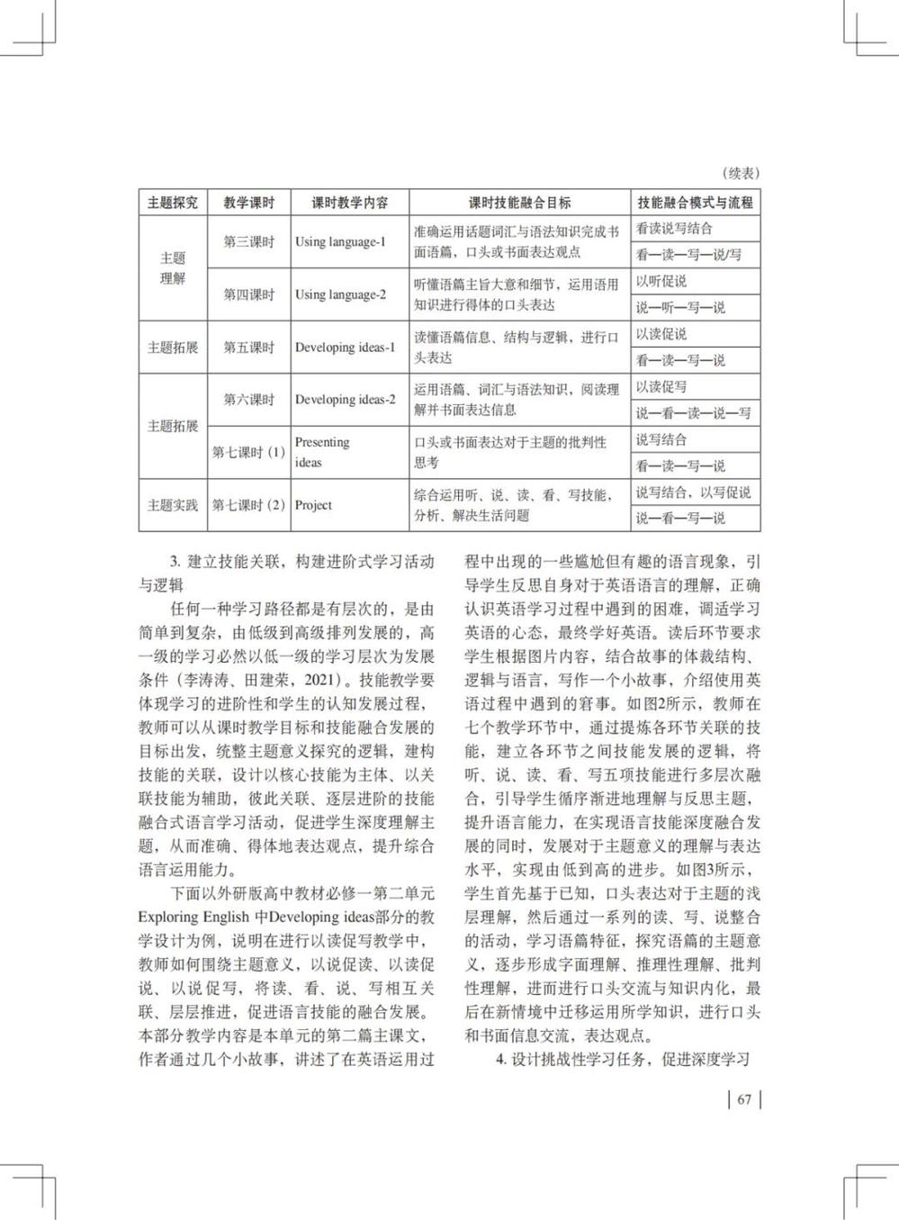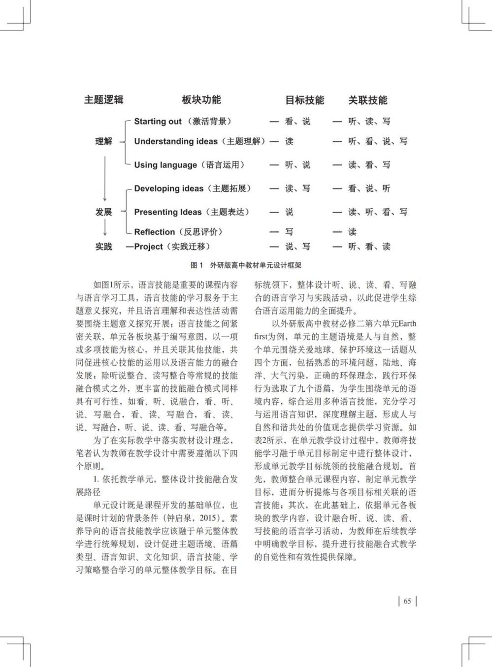 以外研版高中教材为例,刘晓阐述了现行高中英语教材语言技能编写理念,并探讨了语言技能融合发展的原则与路径。为了在实际教学中落实教材设计理念,刘晓认为,教师在教学设计中需要遵循四个原则:一、依托教学单元,整体设计技能融合发展路径;二、顺应主题逻辑,构建课时技能目标与融合方案;三、建立技能关联,构建进阶式学习活动与逻辑;四、设计挑战性学习任务,促进深度学习。素养导向下的技能教学需要教师从素养目标出发,立足“人”的发展,回归语言技能的本质属性,探讨语言技能的价值功能,研究其在课程内容中的功能与逻辑,整体规划课程内容,进而整合语言技能,促进学生充分体验、感知、思悟与表达,融合发展语言技能。