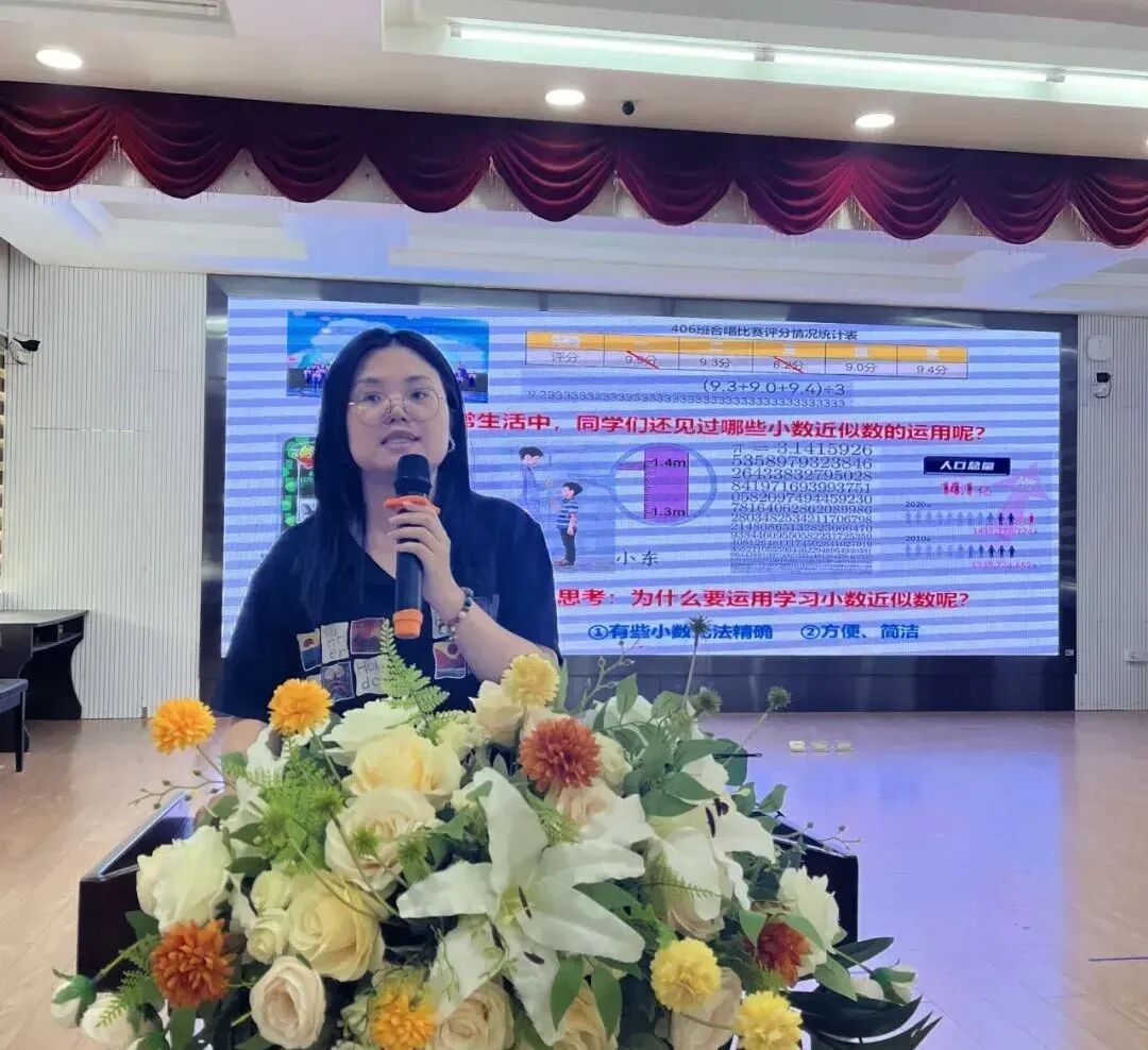 陈楚楚老师分享了“大小数的近似数”课例设计。从现实生活需求出发,引发学生思考学习小数近似数的意义用处。借用线段图的直观表征探索得出求小数近似数的方法,感受“四舍五入法”的算理。通过正逆向的推理及图像表征让孩子感悟小数近似数的区间性、精准度,加深学生数感的培养。