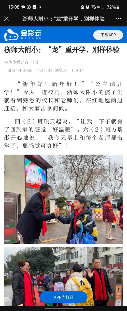 集团动态 当前位置: 首页 > 集团新闻 《金彩云》:浙师大附小“龙”重开学 来源:浙江师范大学教育集团作者: 发布时间:2024-02-27 5月20日,《金彩云》用细腻的笔法勾勒出了浙师大附小学生开学的场景。