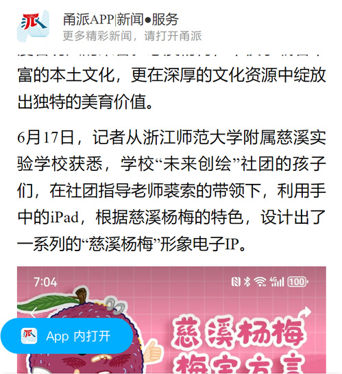 集团动态 当前位置: 首页 > 集团新闻 《甬派新闻》:附属慈溪实验学校“未来创绘”社团活动 来源:浙江师范大学教育集团作者: 发布时间:2024-06-20 6月17日,《甬派新闻》生动描述了附属慈溪实验学校学生在“未来创绘”社团活动中设计“慈溪杨梅”形象电子IP的情形。