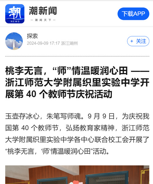 集团动态 当前位置: 首页 > 集团新闻 《潮新闻》:织里中学开展教师节庆祝活动 来源:浙江师范大学教育集团作者: 发布时间:2024-09-12 9月9日,《潮新闻》用细腻的笔法描绘了附属织里中学开展第四十个教师节庆祝活动的场景。