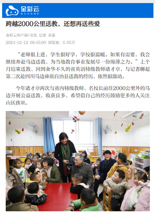 集团动态 当前位置: 首页 > 集团新闻 《金彩云》:教育集团专家团队赴四川马边帮扶 来源:浙江师范大学教育集团作者: 发布时间:2024-12-16 12月12日,《金彩云》用细腻的笔法描述了教育集团专家团队前往四川马边彝族自治县送教的经历。