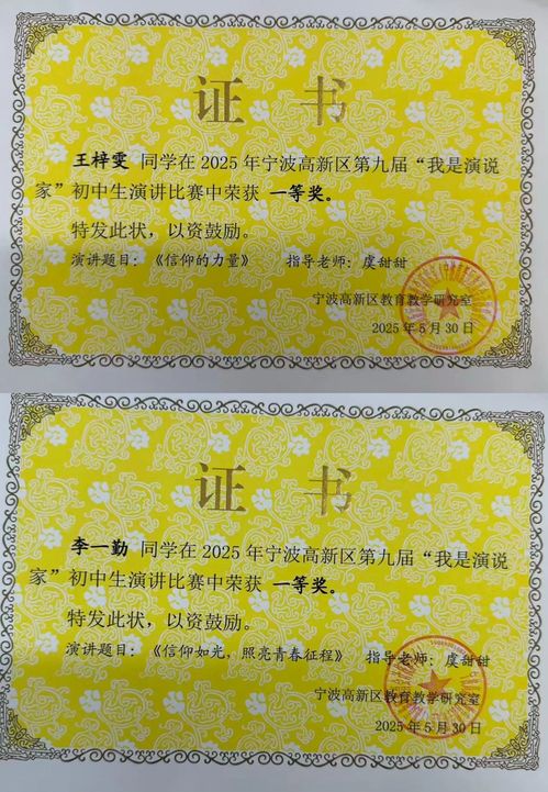 2025年5月,宁波高新区第九届“我是演说家”初中生演讲比赛圆满落幕。在这场语言与思想激烈交锋的盛会中,我校学子大放异彩,七年级的王梓雯、李一勤凭借卓越的演讲技艺与深刻的内涵表达,从众多初二初三参赛者中脱颖而出,双双斩获一等奖,王梓雯同学更是获得得分第一名的好成绩,为学校赢得荣誉。
