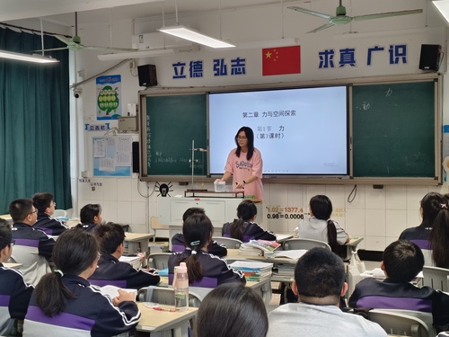 学校新锐教师吴潇寒以浙教版新教材八年级《重力》为题授课。课堂上,吴老师以生活情境为切入点,通过“重力方向探究实验”“物体受力分析”等环节,引导学生从现象到本质,层层递进理解重力概念。学生动手操作积极、小组讨论热烈,课堂生成与教师引导相得益彰,充分展现了学校青年教师扎实的专业素养与创新教学思维。
