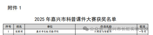 合作学校动态 当前位置: 首页 > 合作学校动态 附属长虹实验学校:学校教师在市级比赛中斩获一等奖 来源:浙江师范大学教育集团作者: 发布时间:2026-01-09 在2025年嘉兴市科普课件大赛中,附属长虹实验学校张丽娟老师的作品《大模型与智能体》荣获一等奖!此次获奖,是附属长虹实验学校科普教育工作成效的又一体现。未来,学校将持续深耕科普教育,助力学生科学素养提升。