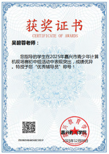 在2025年嘉兴市青少年计算机现场赛(初中组)中,附属嘉善干窑中学学子凭借扎实的编程功底与创新思维脱颖而出。901班谈水君同学荣获一等奖,807班刘泽奇同学荣获三等奖,指导教师吴碧蓉被授予“优秀辅导员”称号。此次赛事聚焦人工智能与算法设计,参赛学生通过团队协作与现场编程,展现了扎实的学科素养与解决实际问题的能力,为学校科技教育再添亮色。