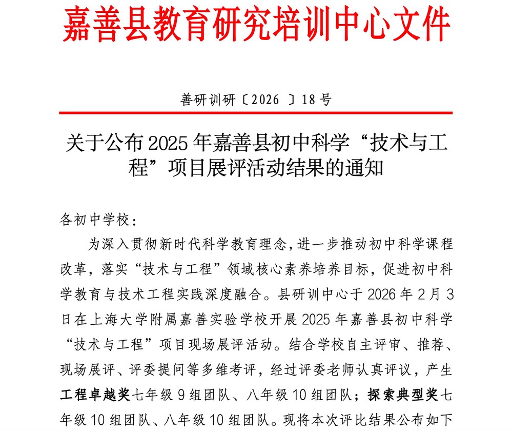 近日,附属嘉善干窑中学在嘉善县教育研究培训中心开展的2025年初中科学“技术与工程”项目现场展评活动中,荣获探索典型奖与工程卓越奖。